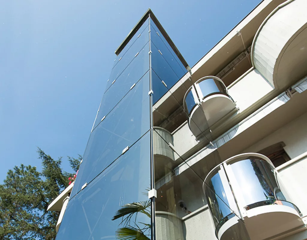 L’ascensore per la casa per esterni Suite, con la trasparenza dei cristalli e l’eleganza delle strutture in acciaio, permette di godere del paesaggio circostante donando valore alla facciata dell’edificio grazie a un design elegante e discreto.